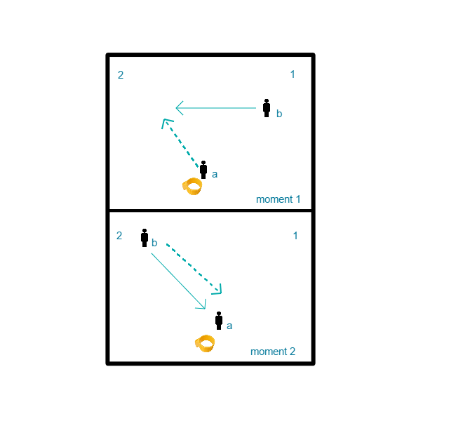 2 Männer pro Korb. Spieler A beginnt auf der linken Seite des Korbes mit dem Ball. Spieler B startet direkt vor dem Korb. Spielerin B läuft von ihrer Ausgangsposition aus in einer geraden Linie zum Korb. Sie streckt ihre äußeren Hände aus, um zu zeigen, wo sie den Ball annehmen möchte. Spieler A wirft (aus dem Raum) den Ball zu Spieler B. Spieler B spielt einen Pass und fängt seinen eigenen Ball. Spieler A geht nach links vorne, B wirft zu A (um zu vermeiden, dass er mit dem Ball läuft), B geht nach rechts vorne und holt sich den Ball zurück, A nimmt nun den Ball mit.