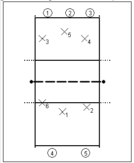 Mannschaft 1(Bälle) bekommt 10 Bälle zum Aufschlagen. Wenn ein Ball gepasst wird und in der Passierlinie gefangen wird, wird er aus dem Spiel genommen, und auch wenn er ins Aus oder ins Netz geschlagen wird, geht er aus dem Spiel. Die Mannschaft mit den meisten Aufschlägen gewinnt.