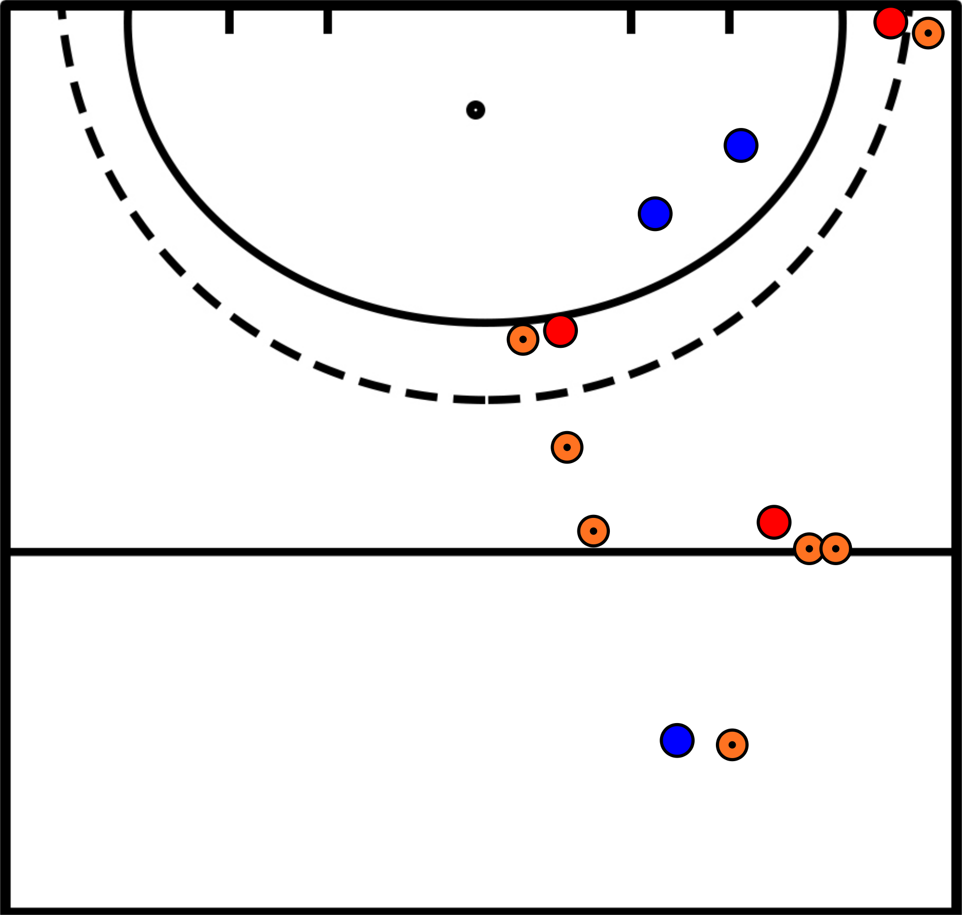 • Wenn der Verteidiger den Ball zurückerobert, versucht er, in das kleine Tor an der Seite zu schießen.