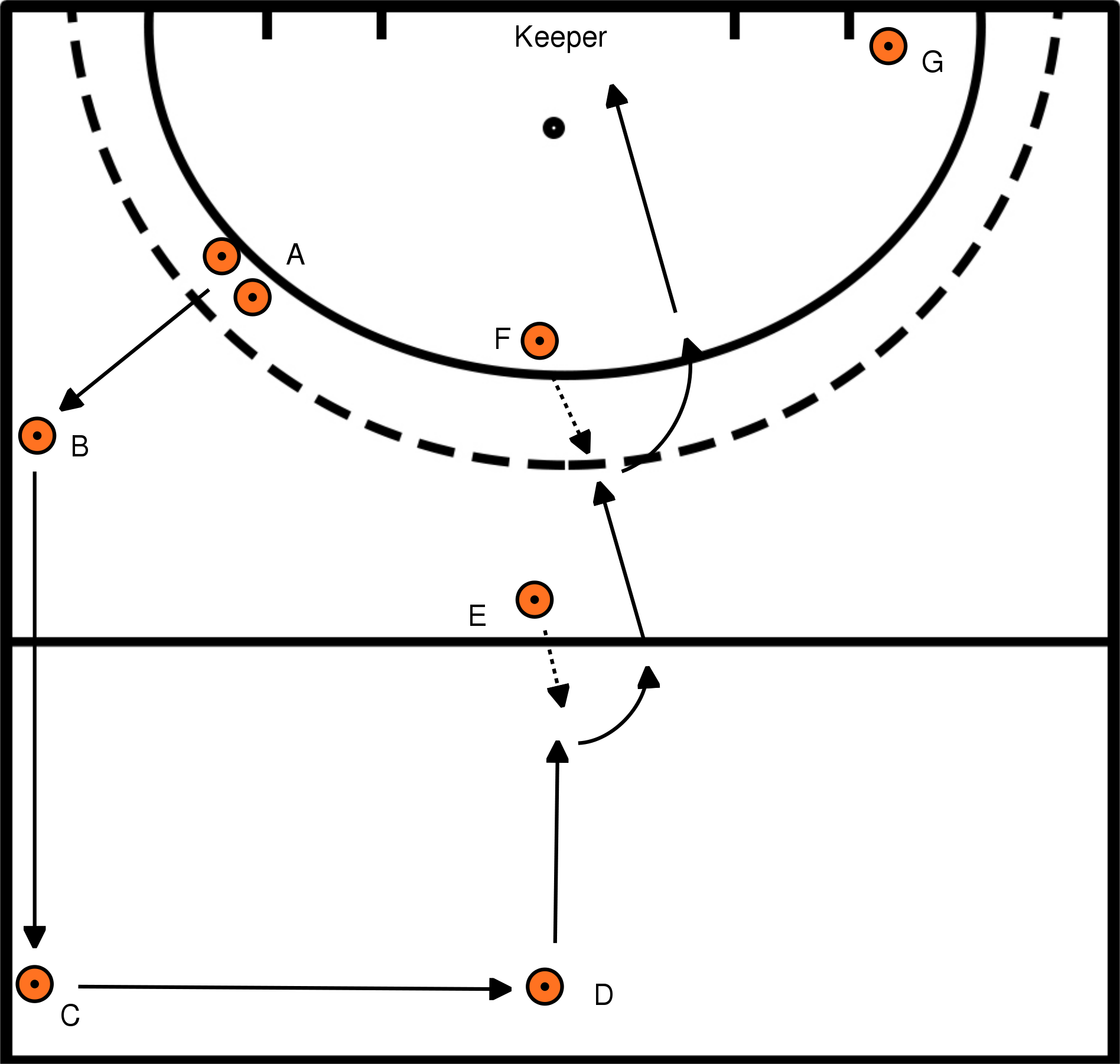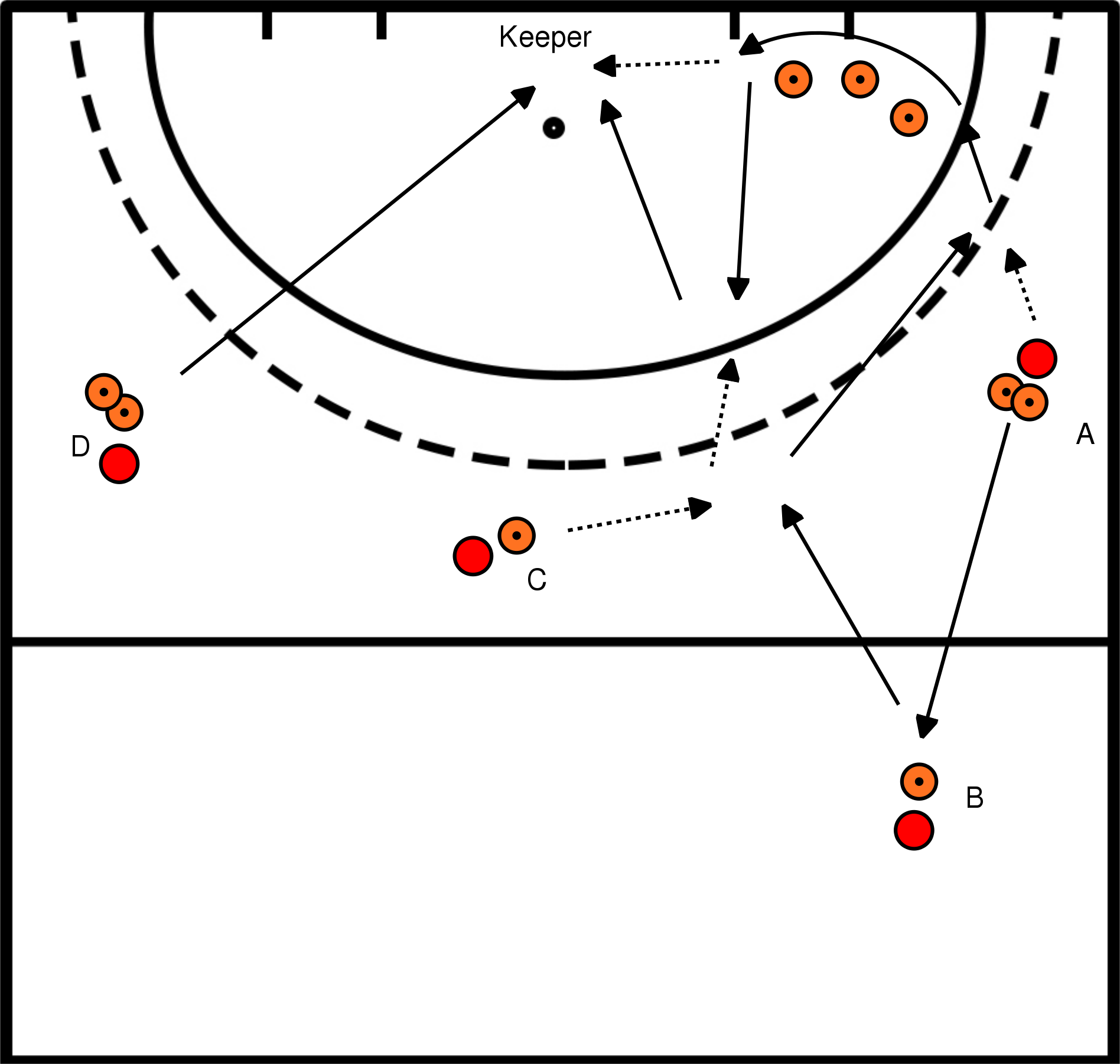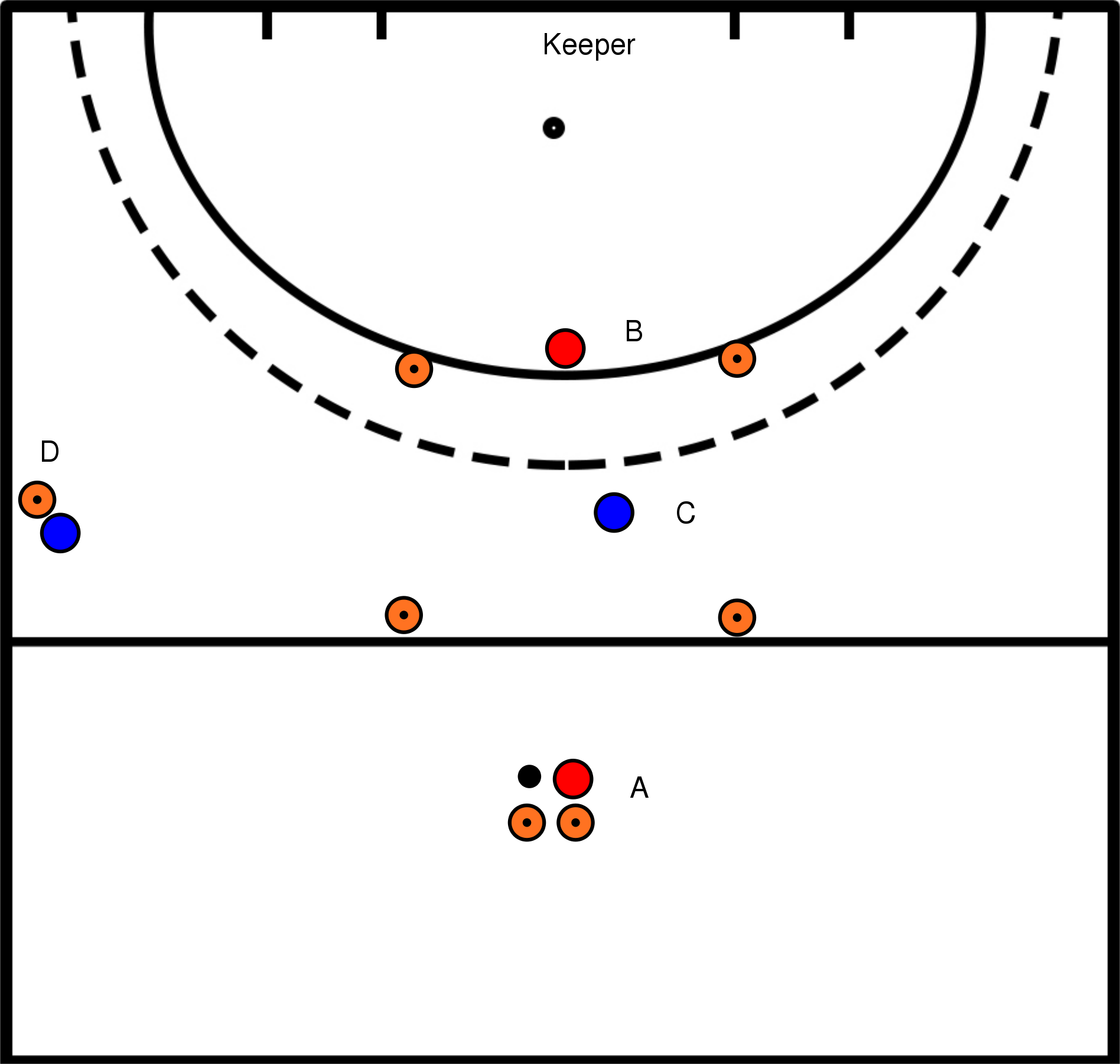 • C und D spielen ein Zwei-gegen-Eins gegen den roten Verteidiger.