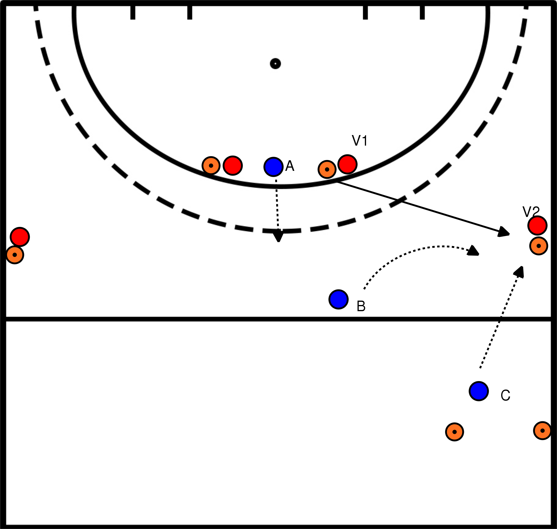• C bewegt sich in den Raum an der Seitenlinie und beschleunigt in diese Richtung.