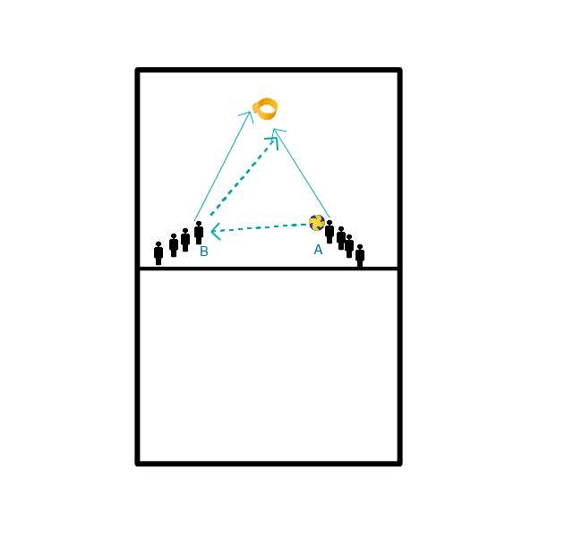 - Wirf zu Spieler A und laufe zum Korb, um ihn zu unterstützen.