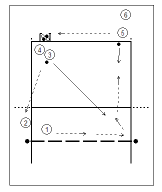 - 1 blockt erst in der Mitte und dann vorne links - nach dem Block umdrehen und Angriff von 3 hinten abwehren - dann (im Sturzflug) kurzen Ball von 5 abwehren - 2 ist dran Turn over: - 1 zum kurzen Ball - 3 zum Blocken - 5 zum Angriff