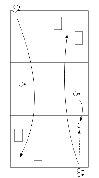 - Nach dem Aufschlag einen Pass ins Netz auf einen zugespielten Ball