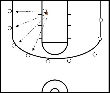 - Spieler 1 macht ein Give-and-Go mit dem Spieler 2 in der Ecke