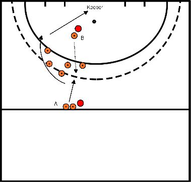 - B nimmt den Ball mit einem Heber an und kontrolliert ihn, beschleunigt zum Kreis, legt sich den Ball zurecht und spielt einen harten Pass auf den 2.