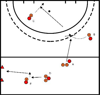 - D erhält den Ball, so dass er um den Ball herumlaufen und sofort mit einem Schlag abschließen kann.