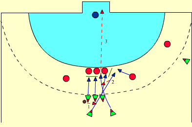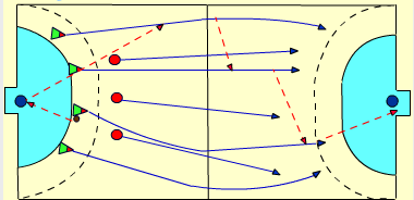 - (Die Spieler der Gruppe 2 sprinten zur gegenüberliegenden Seite und versuchen, den Ball in der Mitte des Spielfeldes aufzunehmen, werfen den Ball zum Spieler der Gruppe 1, der ihnen gegenüber steht, erhalten den Ball zurück und machen 3 Pässe und kippen mit Tempo zur gegenüberliegenden Seite, Nullpass bei der Ankunft an der Seitenlinie.