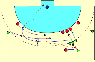 - MO geht weiter in die Ecke und spielt einen Pass nach hinten zum startenden LH, LH übt Druck auf UR aus, LO startet in Richtung Zentrum