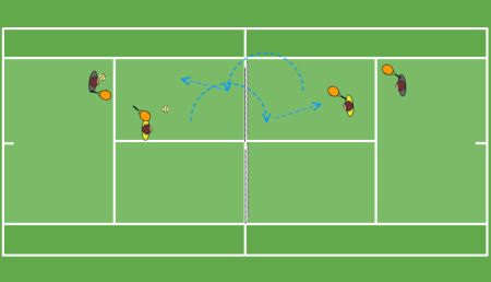 - Zusätzliche Aufgabe: Das zu spielende Schlagmuster ist schwieriger, da wir in einer "one up"-Formation spielen. (= ein Spieler am Netz und ein Spieler in der Abwehr)