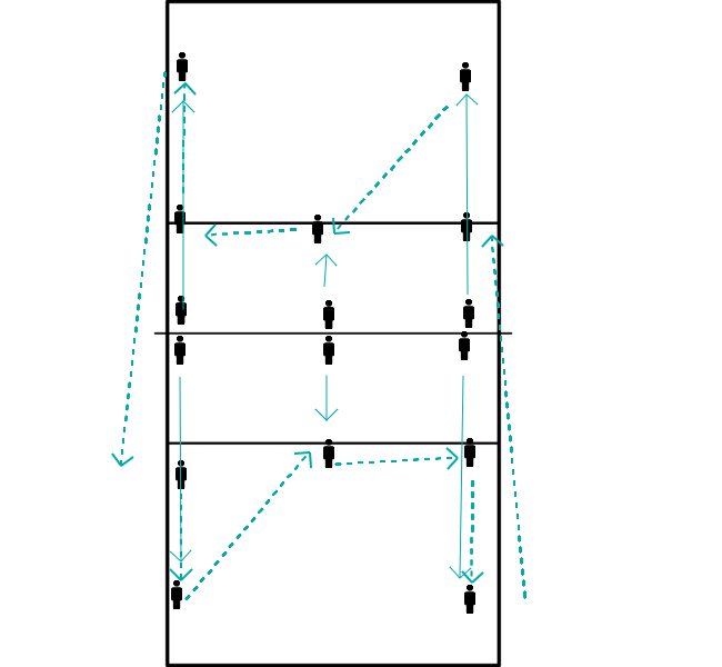 - Kind 1 geht schnell unter das Netz und stellt sich auf die Mittelfeldposition