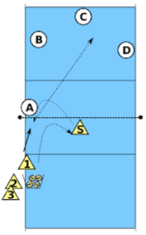 • Beim Anstoß läuft 1 nach vorne und gibt den Ball mit der Unterhand an 3 weiter.