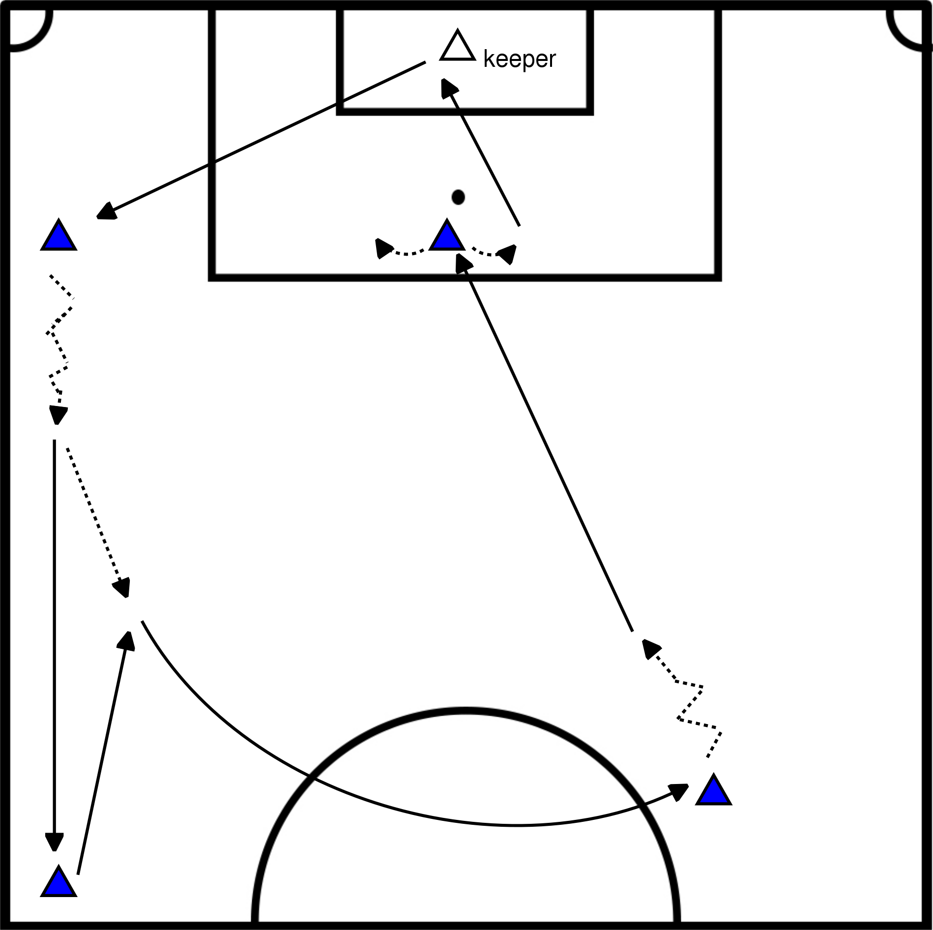 - Keeper shoots out, playing striker with back to goal, striker turns away