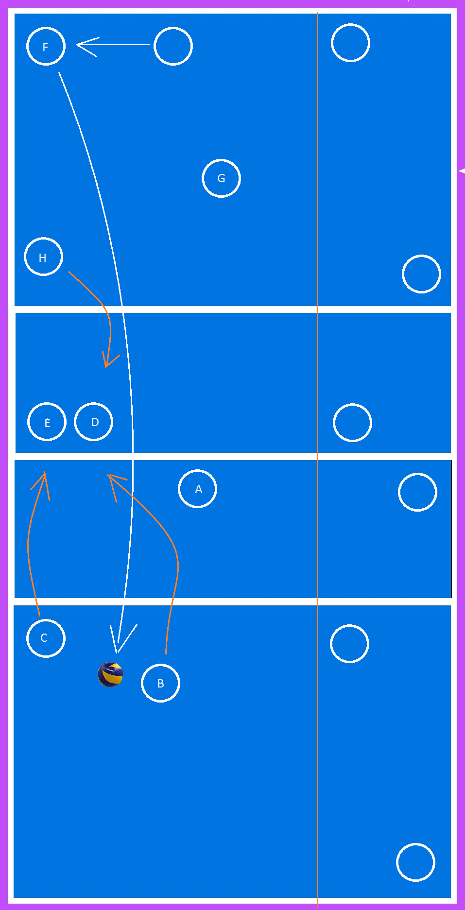 - Passer learns to pass a deepball diagonally backward and a short immediate after (learns to make large angles) the playmaker has to look for the next ball immediately after the first set up.