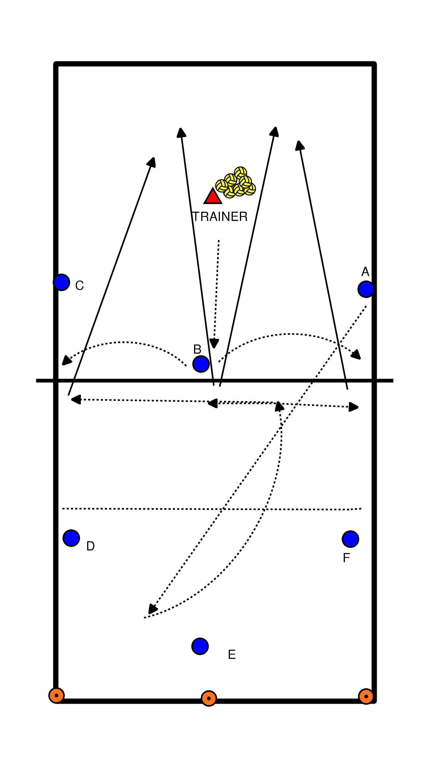 - Players EDF slide as taught and defend that ball and the setter runs into the one who has not defended the cone and goes directly to his home position and the reception player goes directly to his home position then gives the setter a pass and if there can be attacked nice and in the field then they get a point after 10 points slide.