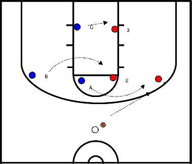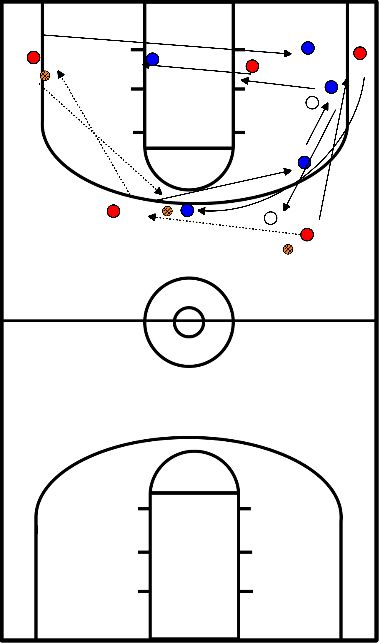 - White passes the ball to blue and immediately makes a cutting movement towards the basket.