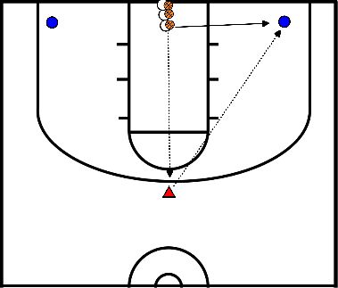 - With 10 players or more, there is also a player (4) in the far corner. In that case, player (3) passes to player (4), who then gives a bounce pass to player (1) and subsequently grabs the rebound and becomes player (1).