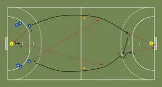 - 1st goalkeeper throws ball to buildup who run a fast break with the three of them.