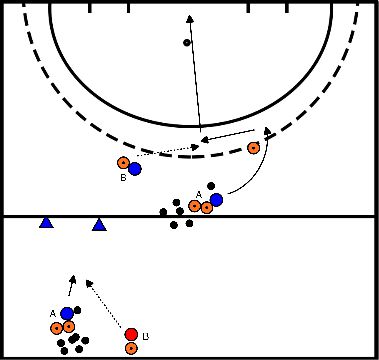 - Player D runs with the ball along the baseline back into the circle and plays the ball to the top where Player A is now positioned.