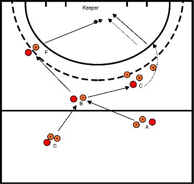 • B takes the ball strongly and turns away past the pawns. Keep the ball on the stick.