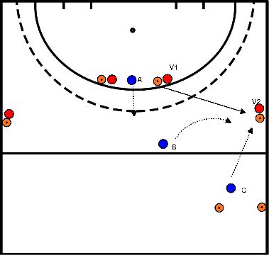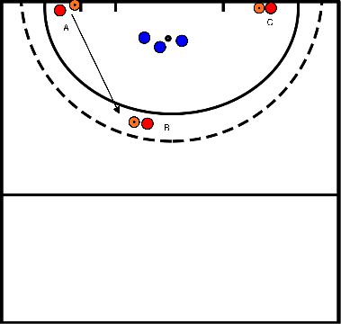 - Player A has continued running and receives a hard pass from Player C towards the circle.