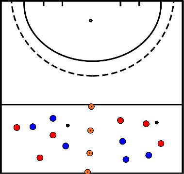 - Player in red starts at the top of the circle and accelerates with the ball through the gates.