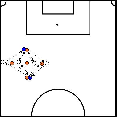 - Players number 1 and 3 perform a one-two with players number 2 and 4 and attempt to score.