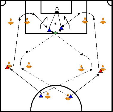 - The striker slaloms through cones back to the starting position.