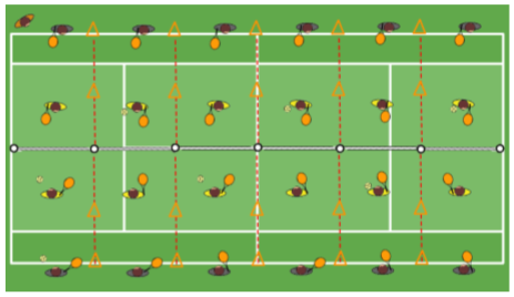 There are 4 balls randomly indicated after each ball the student must go around the jar in axe pass from back to front, the 4 jars are lined up back to back in the double lines.