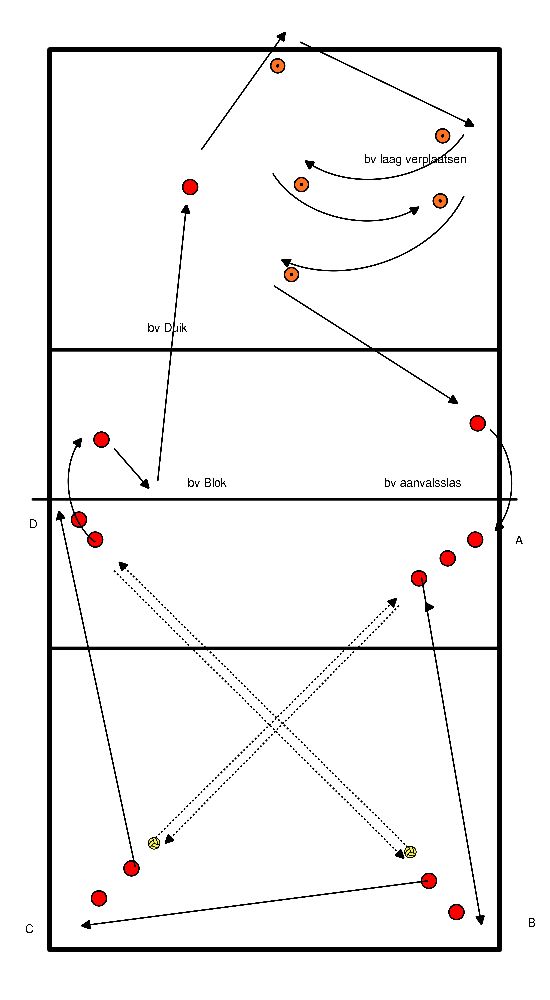 - 1 server, on the other side of the field 3 passers, with behind them again 3 passers who are ready.