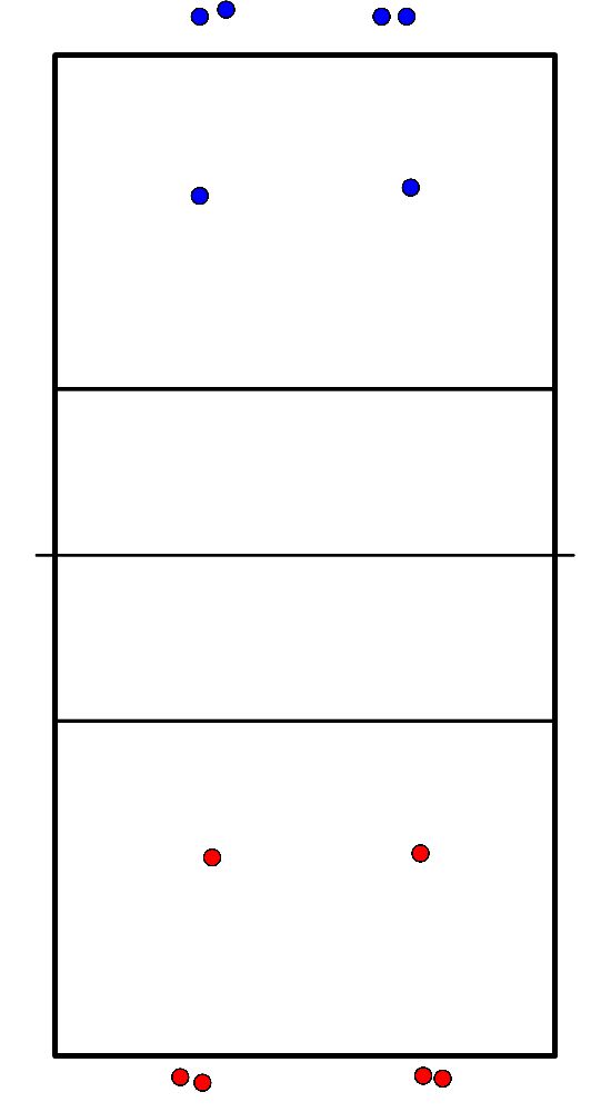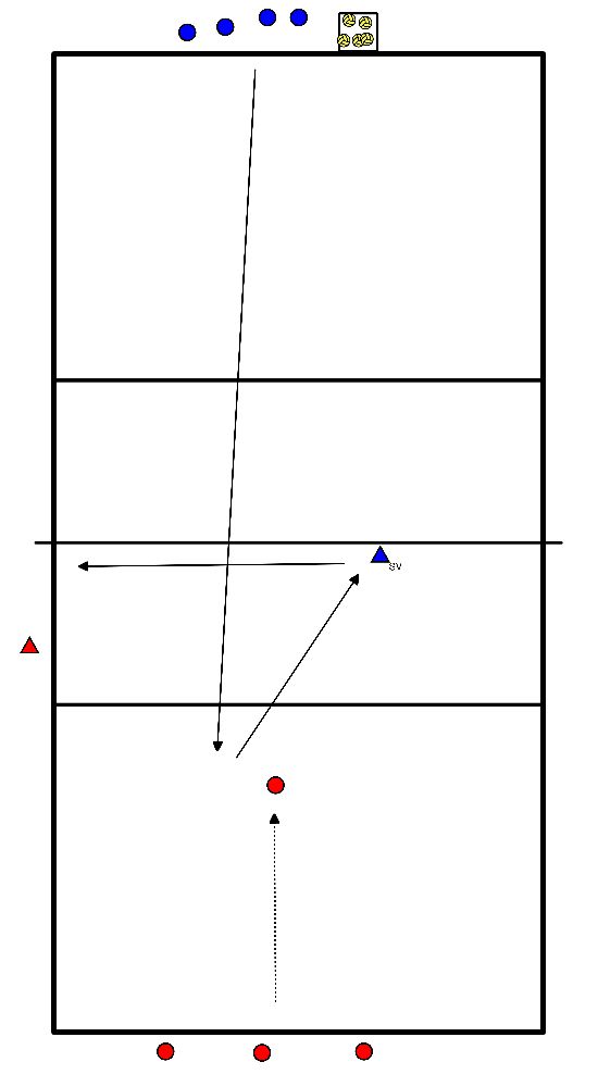 - Defender 1 moves in and plays an overhead pass to the setter.