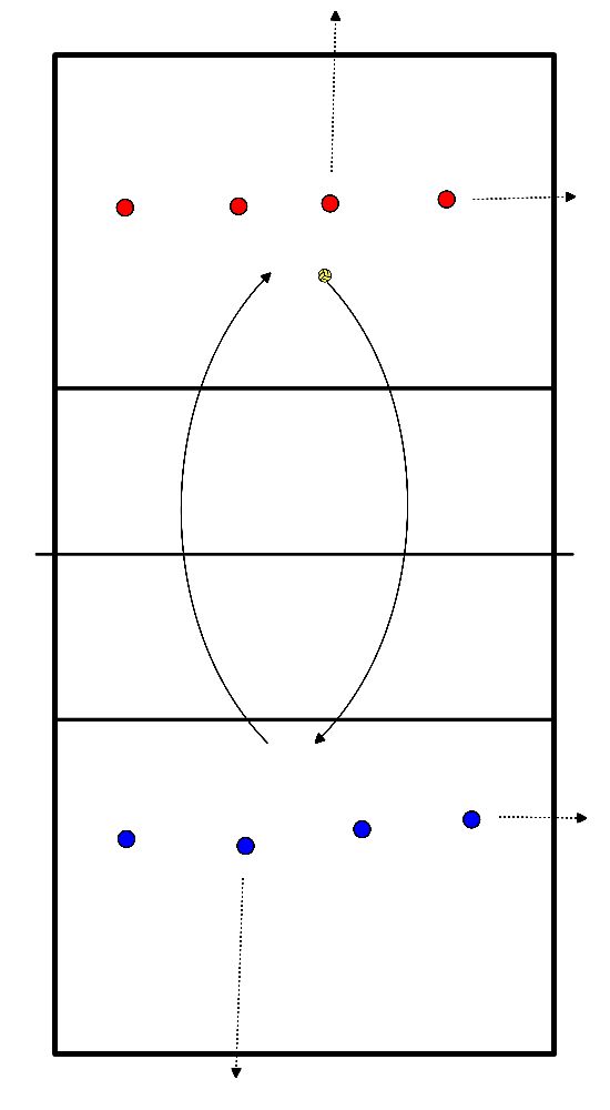 - Players pass the ball over the net and then run around the net post to join the other group.