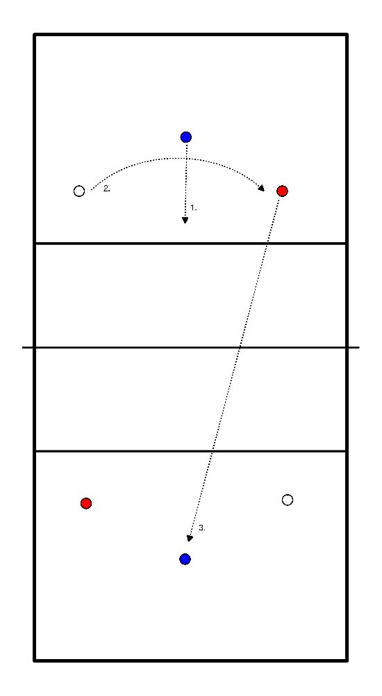 - Player at the net constantly distributes the ball to a defender with ball --> player throws his ball to player without ball and passes the ball back to the player at the net.