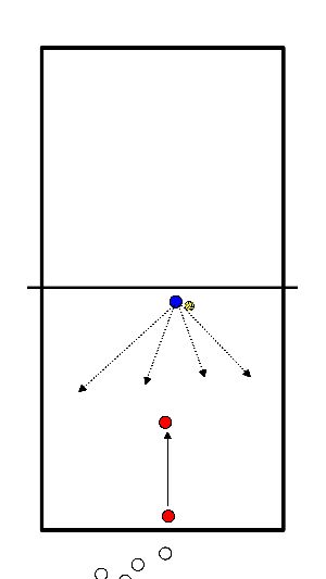 - Player at the net constantly distributes the ball to a defender with ball --> player throws his ball to player without ball and passes the ball back to the player at the net.