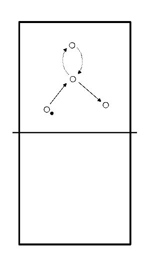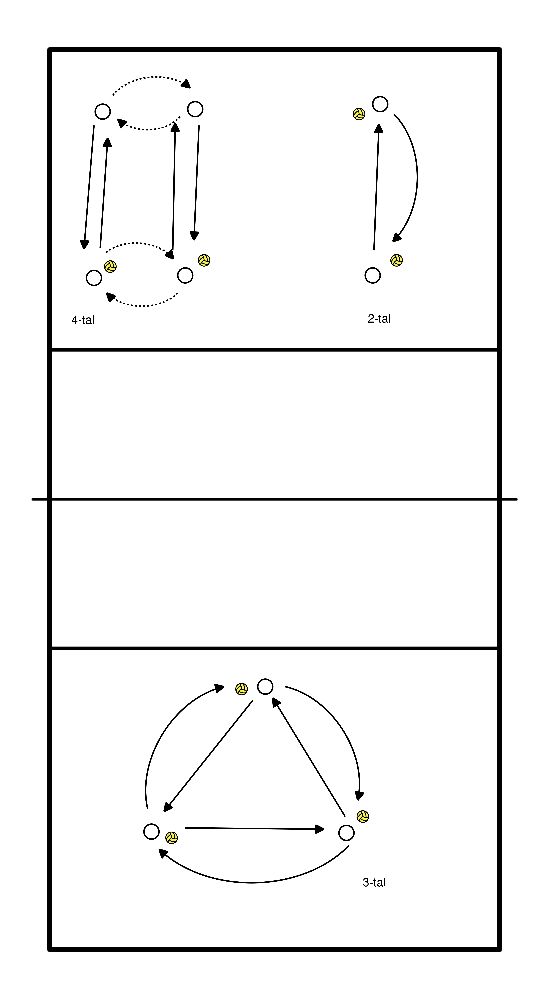 - 2 on 2, each side passes, gives a setup and then an attack behind the 3 meter line.