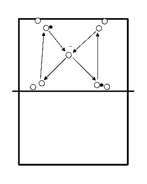 - After service the player runs directly to position 5, where the trainer throws a ball for passing at 2-3.