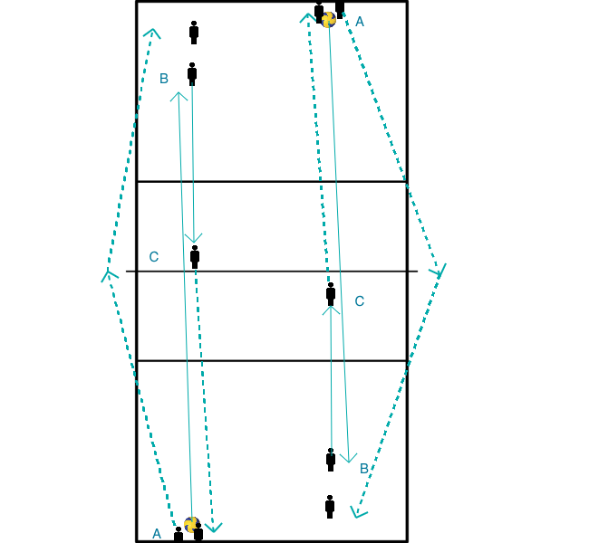 - On both sides of the net there is a row of players. The first has no ball and the others do.