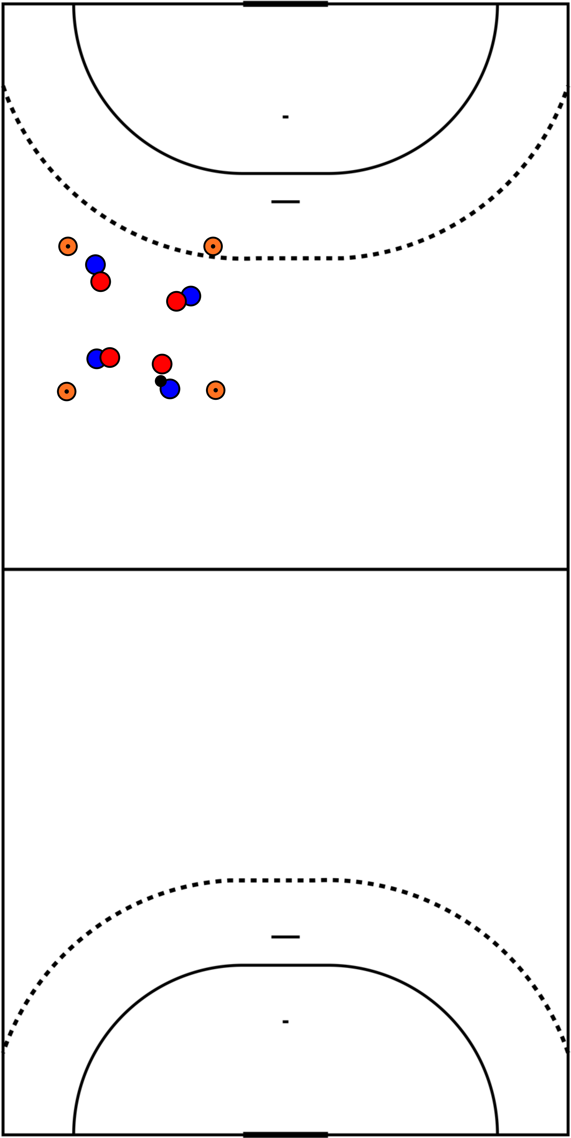 • Technical: Right-handed player: after the two-foot landing, turn backward with the right leg and place it down. Take one step with the left towards the goal. In the turn, already bring your arm into shooting position (so lift it up). Stay as upright as possible. Push off with your left leg and make your jump shot at the goal. A left-handed player does this exactly the opposite way.