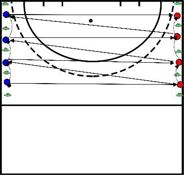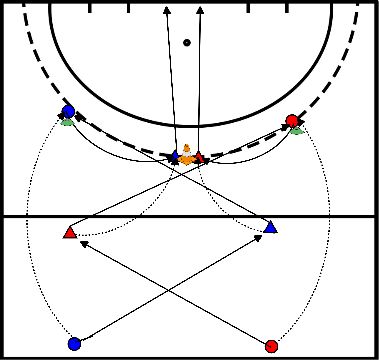 Els jugadors (Cercles) passant les pilotes als altres jugadors (triangles) del seu mateix color i corren fins on hi ha els conus (verds).
