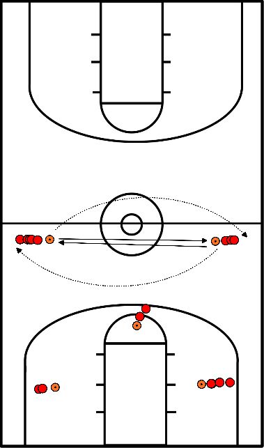 - Después del tiro, el otro equipo corre desde la línea de fondo hasta la otra mitad de la cancha y hace el mismo ejercicio.