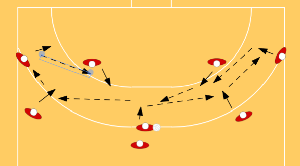 - Poner 2 defensores (rojo) justo dentro de la línea de 9 metros.