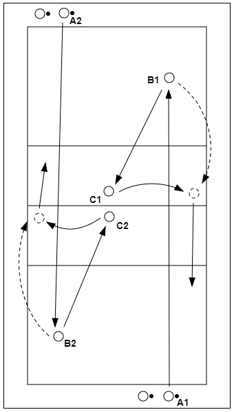 - La persona que estaba en la posición 1 se dirige a su propia línea de fondo para sacar.