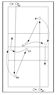 - El jugador B se desplaza lateralmente hacia el jugador C y vuelve a pasar por encima de la red, etc. etc.