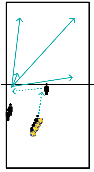• 1 jugador en la red, 2 jugadores en el fondo derecho, listos para el pase,