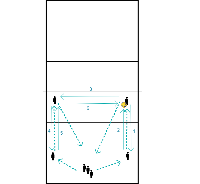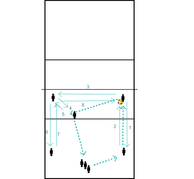 - El otro jugador corre hacia dentro y da una puesta a punto en la línea de 3 m