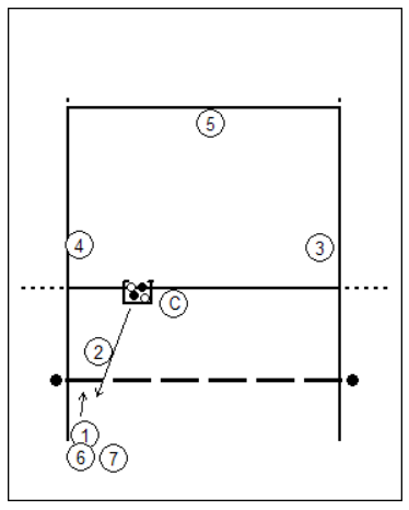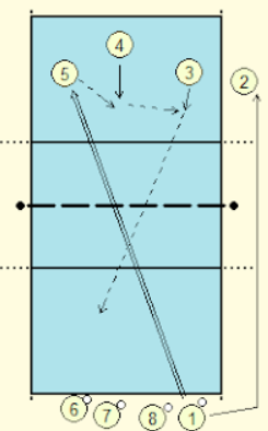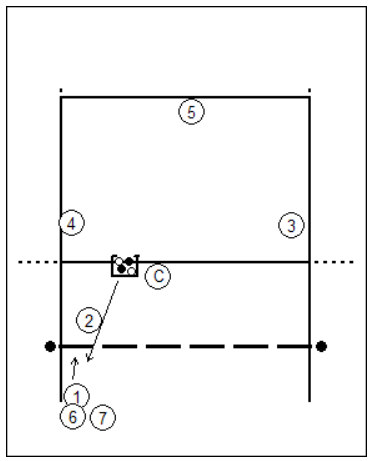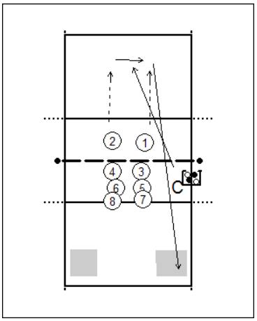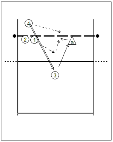 - El jugador con el balón lo lanza al centro, que lo devuelve y pasa al otro jugador que acaba de lanzar el balón.