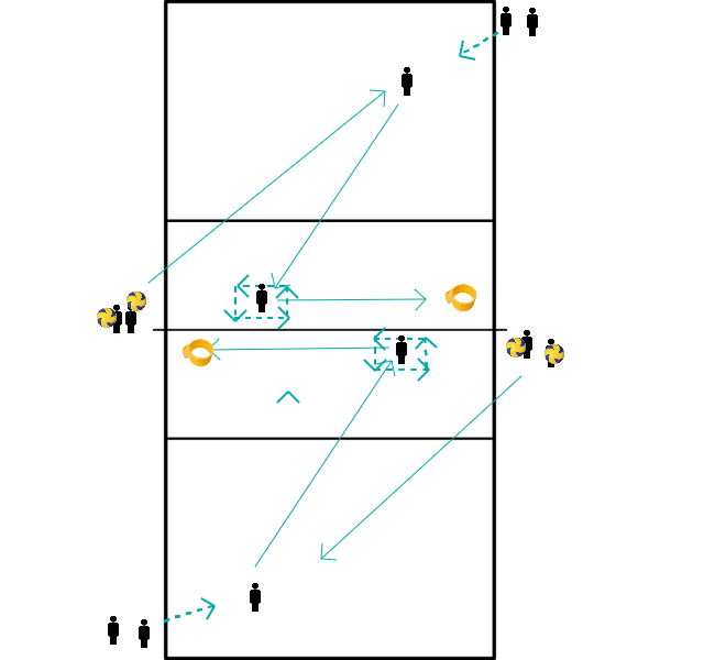Ballon à fort tempo par-dessus le filet, passe au passeur, le passeur joue vers le panier.