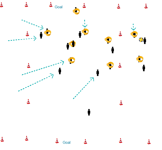 Longueur : Les défenseurs doivent essayer de ne pas entrer dans la dernière case lorsque l'adversaire a le ballon. Les défenseurs de l'équipe qui a le ballon doivent veiller à ce que les distances ne soient pas trop grandes et doivent donc s'aligner.