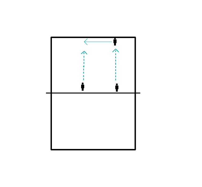 - Le passeur se tient en position de départ dans le champ arrière et se déplace latéralement face aux joueurs 1 et 2.