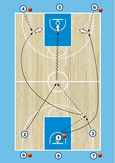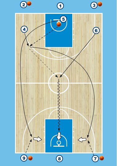 - 1 et 4 jouent 1 contre 1 sur le panier du côté d'où ils sont venus